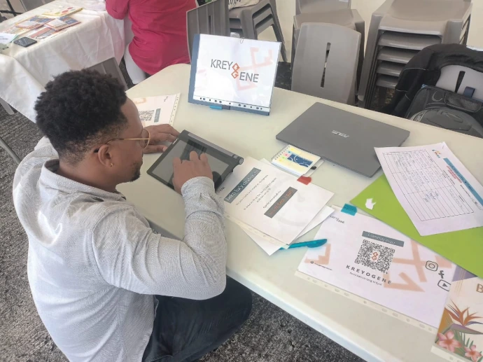Nous mettons en place un espace ludique avec plusieurs outils pour jouer et s'immerger dans la langue et la culture de la Martinique. Avec des jeux créoles numériques et physiques, nous créons un environnement où les participant peuvent sentir, partager, écouter, et découvrir la vie de la Martinique (faune-flore, histoire, etc...).